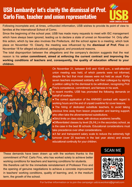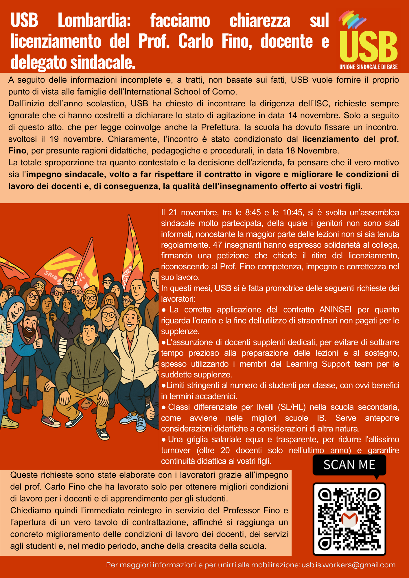 Assemblea USB all'International School of Como: se non si reintegra Carlo, pronti allo sciopero
