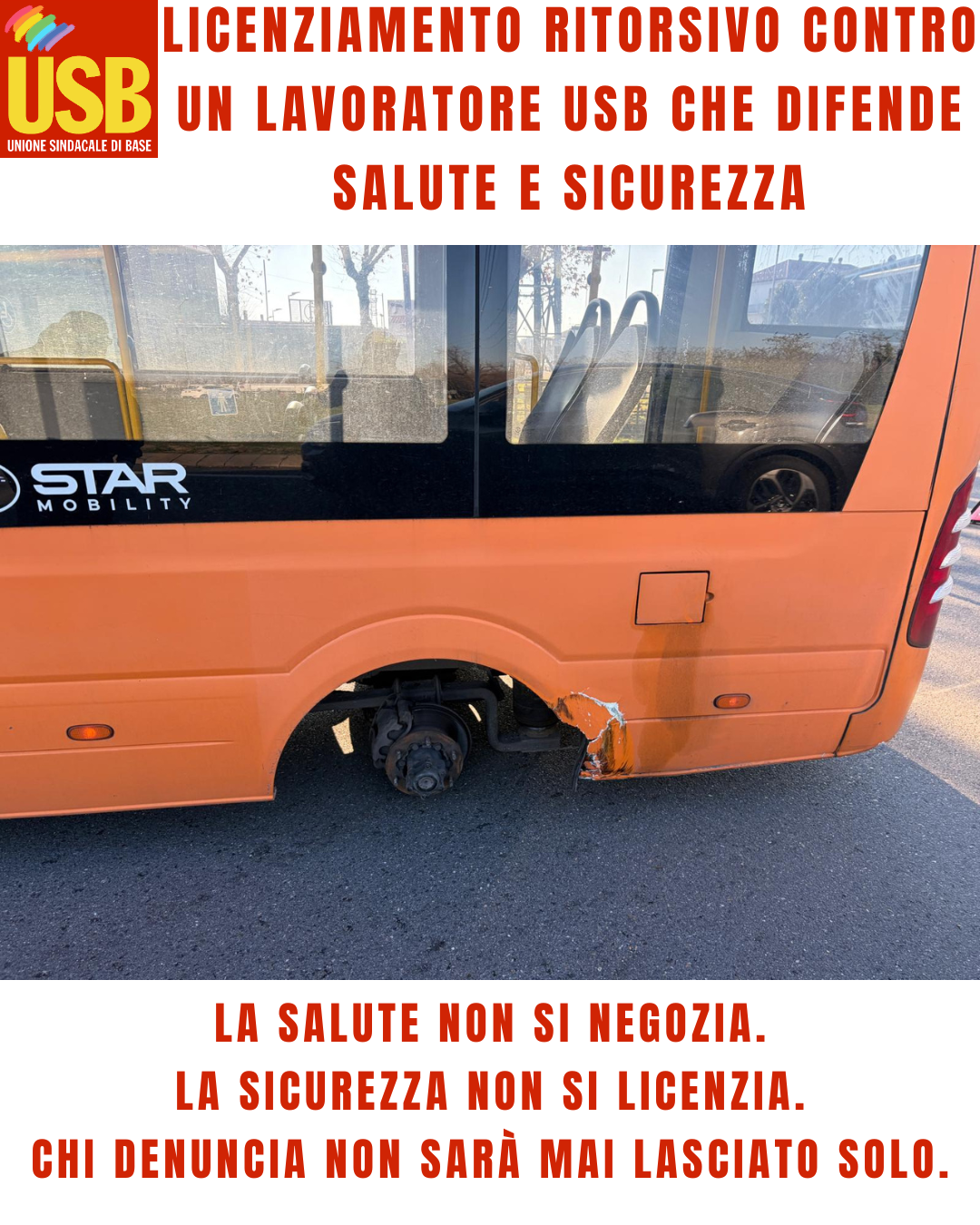 Nel gennaio 2025, a seguito dell’imposizione reiterata dell’utilizzo di un mezzo più volte segnalato come inidoneo alle sue condizioni di salute, Antonio dovuto ricorrere al Pronto Soccorso. Da quel momento, il lavoratore ha legittimamente rifiutato l’utilizzo di quel mezzo e di un altro mezzo “gemello”, affetti dalle medesime criticità, entrambi tra i più vecchi dell’intera flotta. Un rifiuto limitato, motivato e accompagnato dalla costante disponibilità a prestare servizio su mezzi idonei, senza mai sottrarsi al lavoro né compromettere la continuità del servizio pubblico. I mezzi, vecchi di 19 anni, avrebbero dovuto essere dismessi già da tempo, come previsto dal contratto di servizio di Starmobility. Ma l’azienda non è attenta alla cura dei mezzi, infatti nel dicembre 2025 un autobus in servizio ha perso entrambe le ruote durante la marcia. Un evento che solo per circostanze fortuite non ha provocato feriti o vittime e che conferma drammaticamente quanto USB denuncia da tempo in merito all’assenza di un’adeguata manutenzione del parco mezzi.